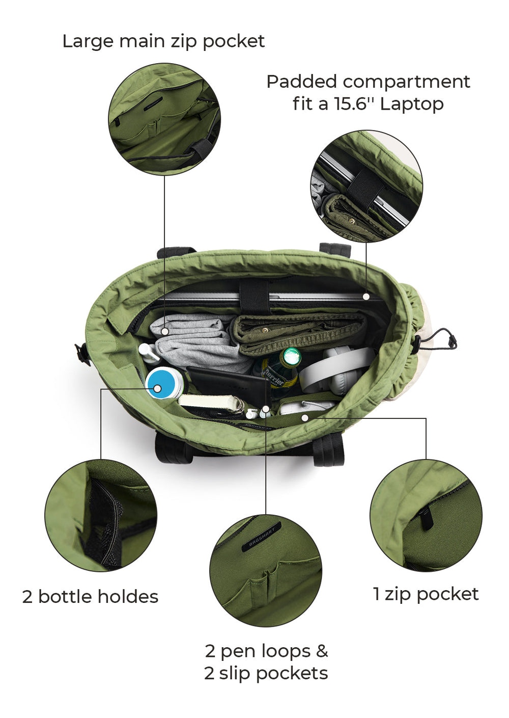 Laptop Compartment: Fits a 15.6-inch laptop in the main pocket, and a smaller pocket for items like iPad, Kindle, or Nintendo Switch.