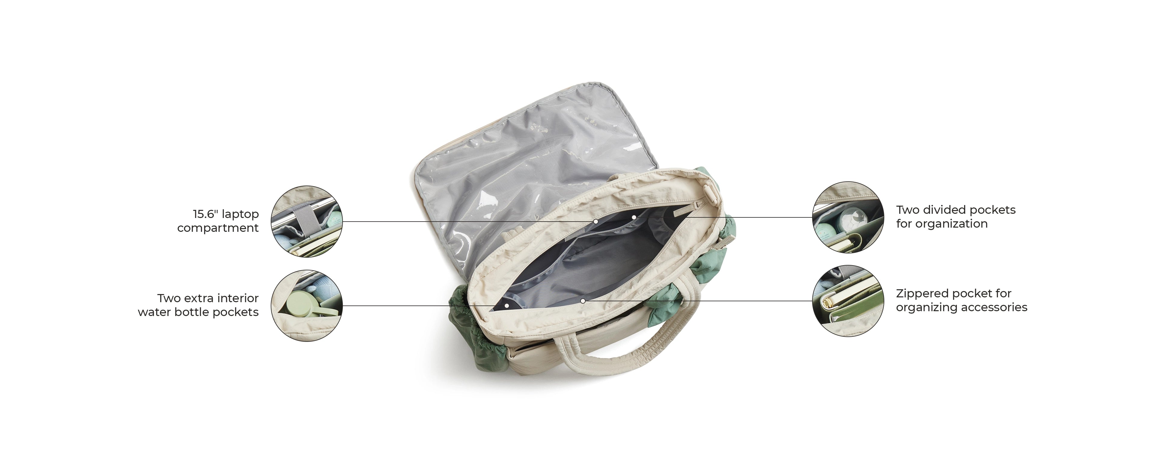 - Extra elastic bottle pocket inside the main compartment for upright storage on busy days.