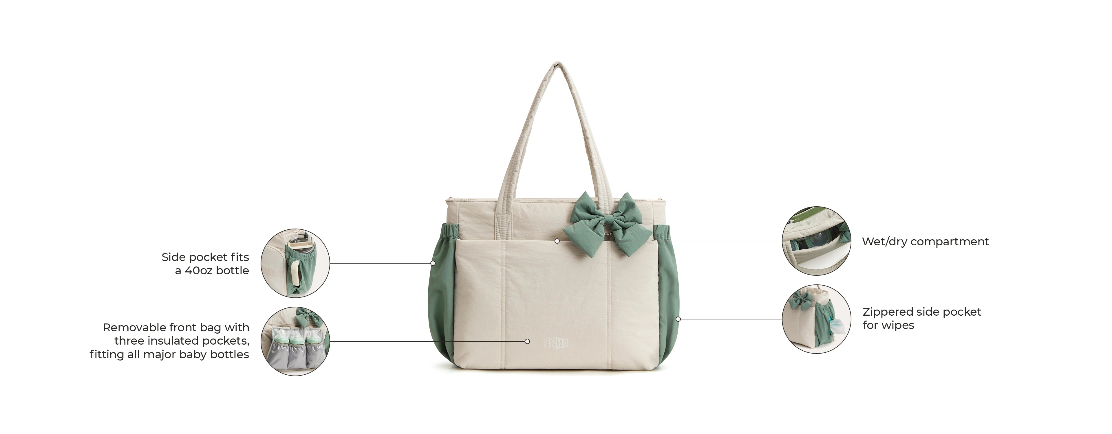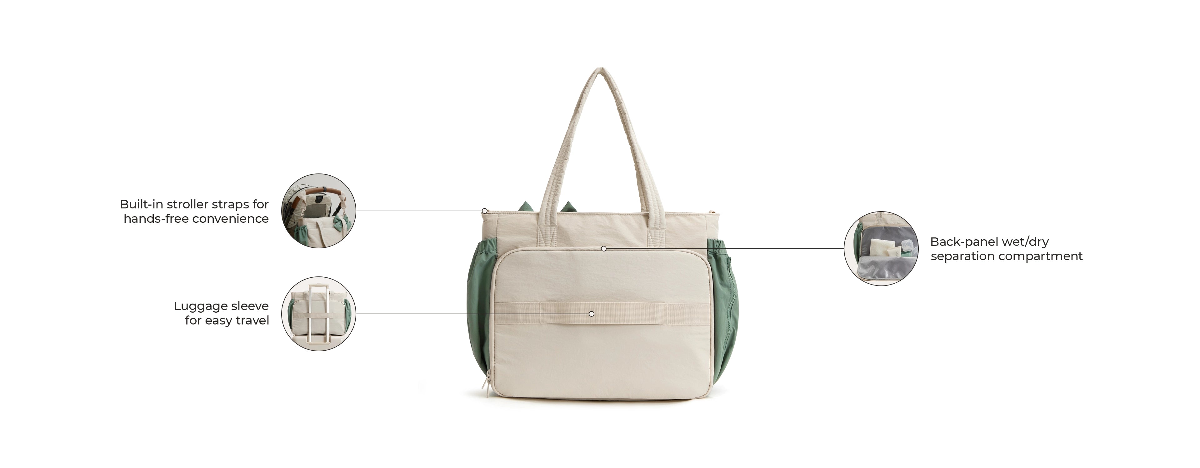 - Two side pockets designed for a 40oz handled cup and wet wipes, each with their own zip port.