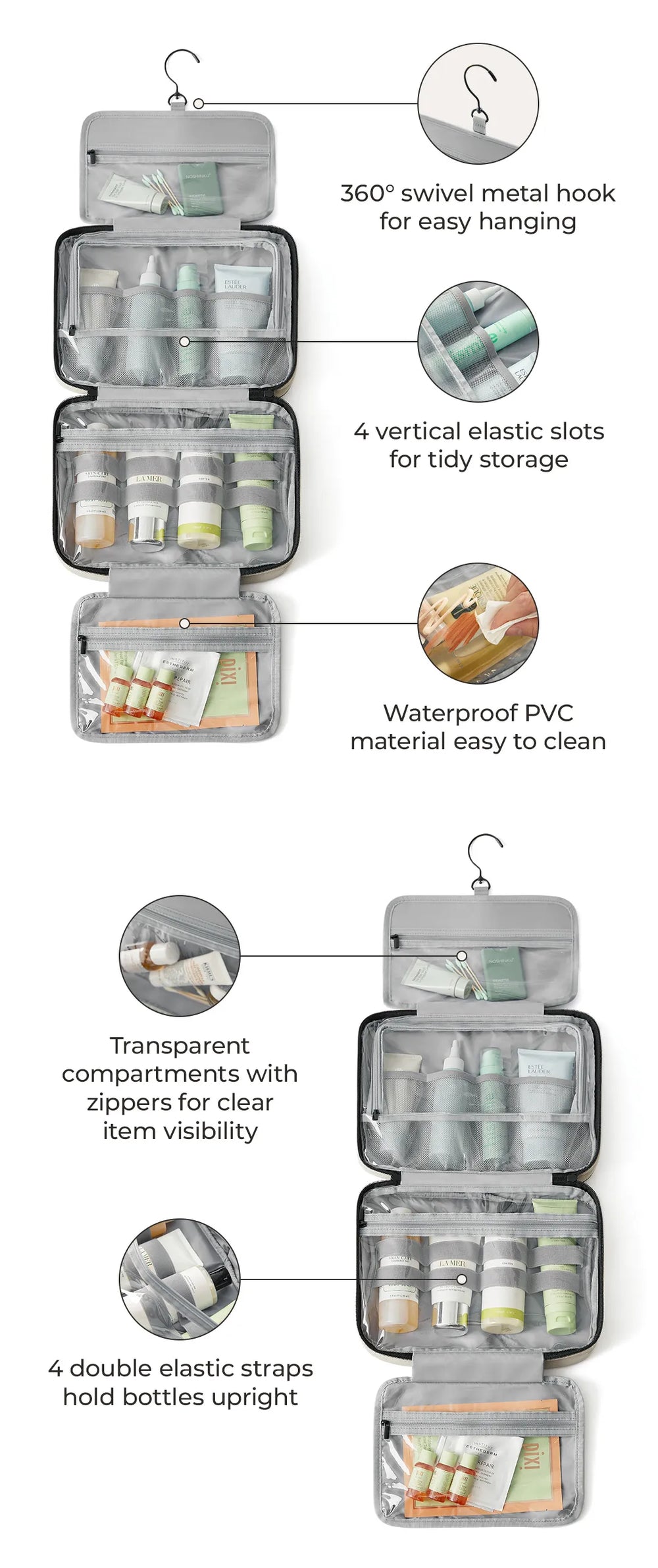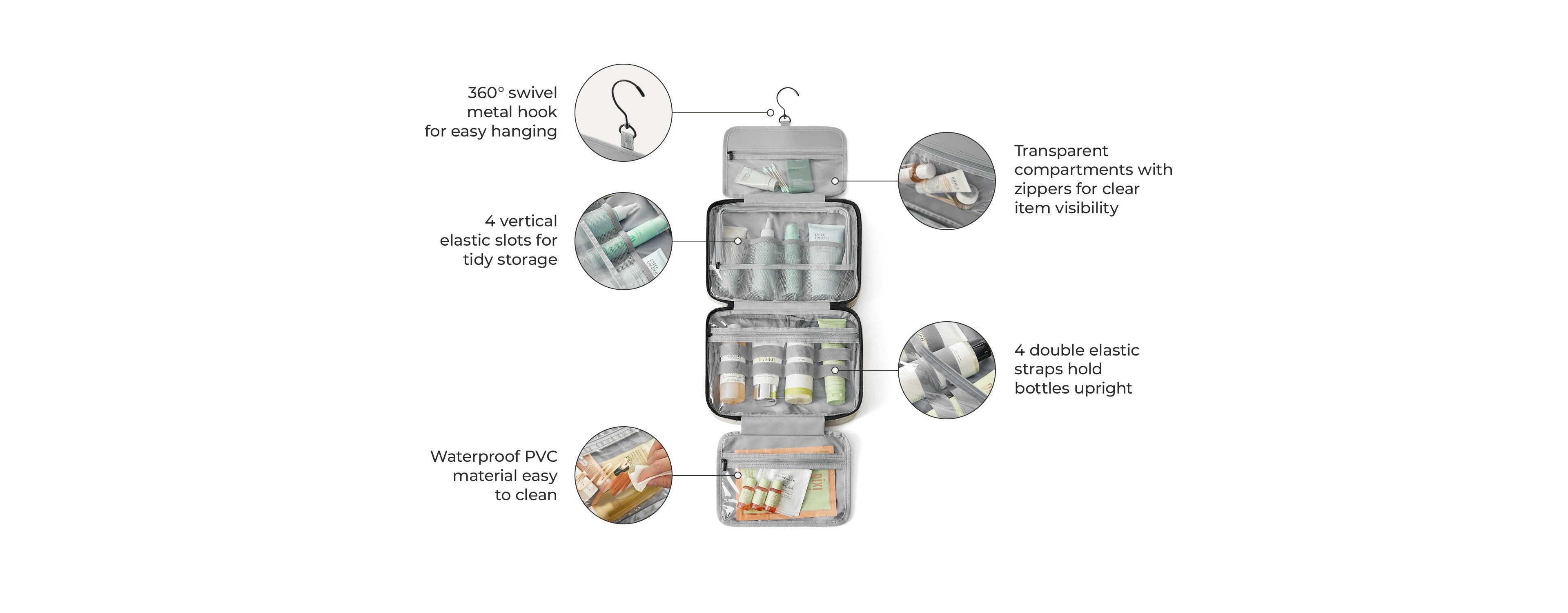 • SMART ORGANIZATION: The bag is designed with elastic straps that securely hold your products upright and in place, preventing spills and keeping everything organized.