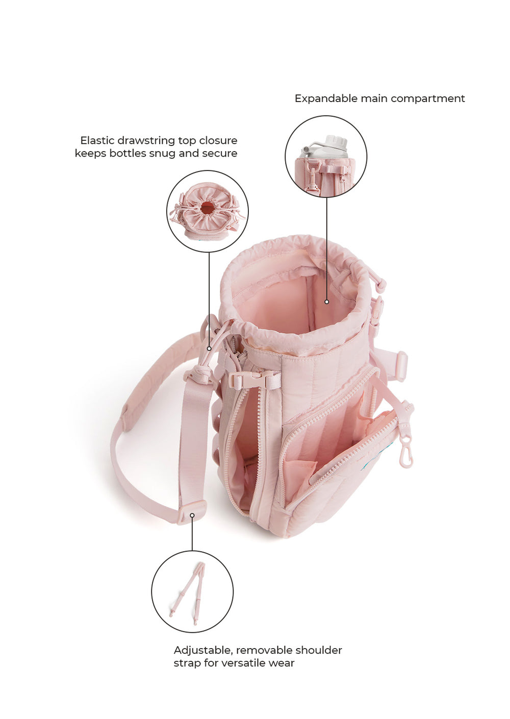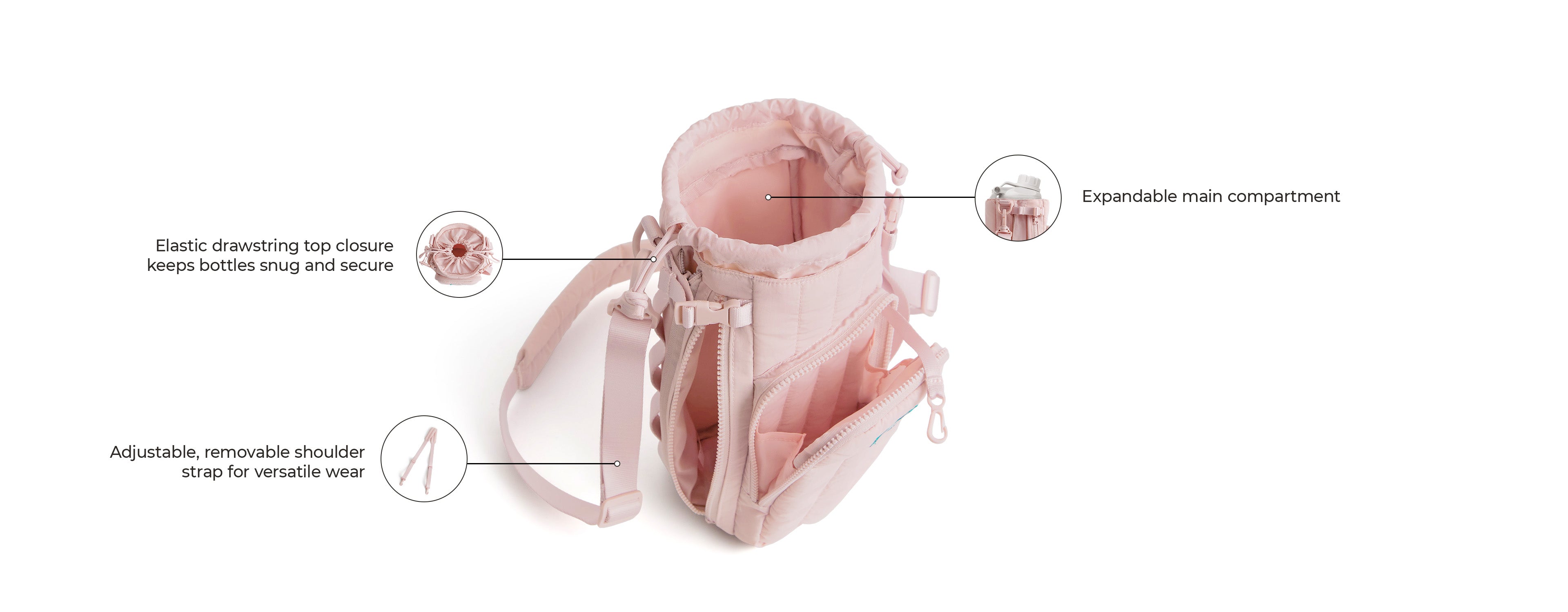 - Adjustable drawstring keeps bottles snug and secure.
