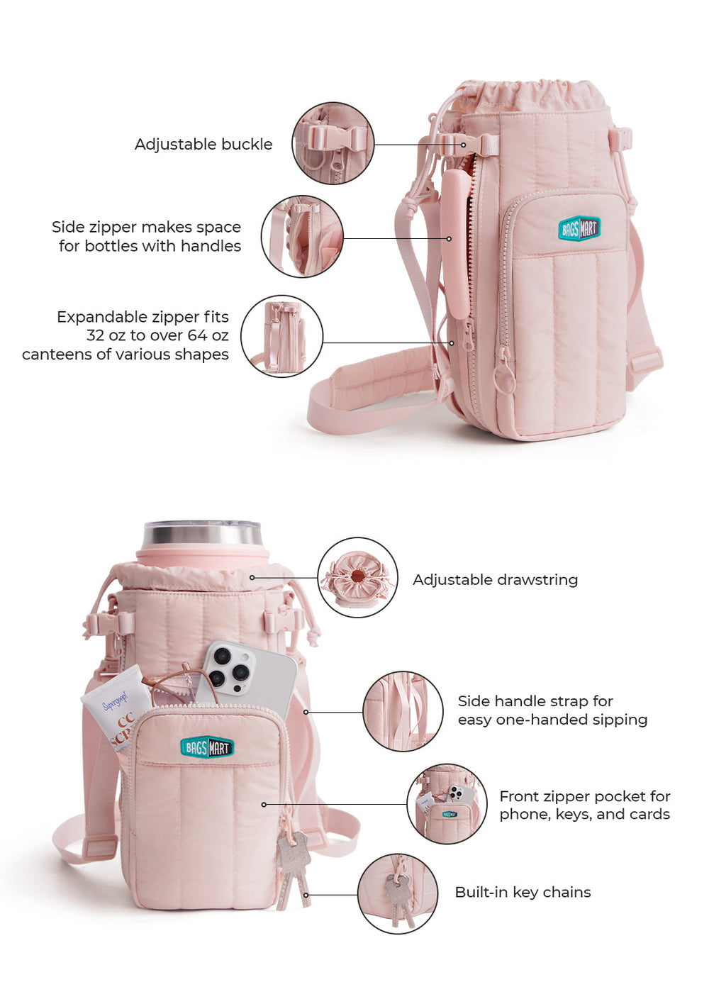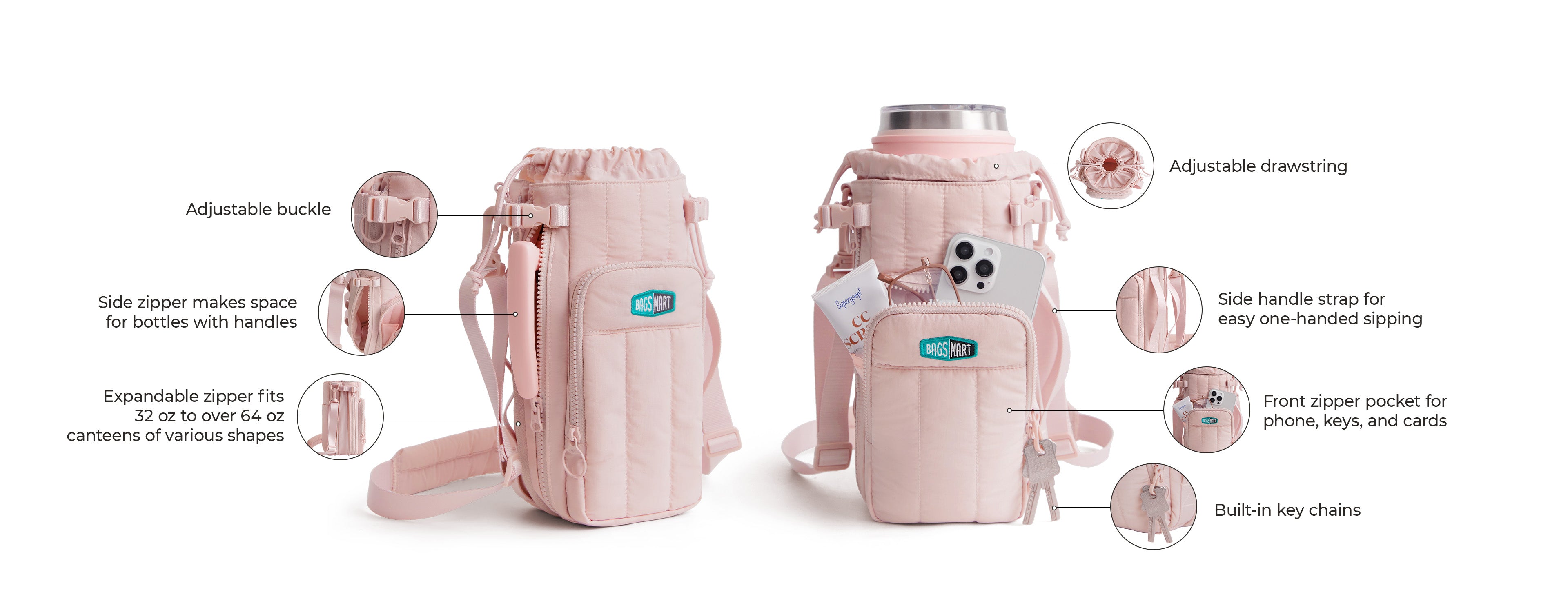 - Expandable Design: Expandable zipper and exterior cinch pocket accommodate 32oz to over 64oz canteens, fitting various bottle shapes and sizes.
