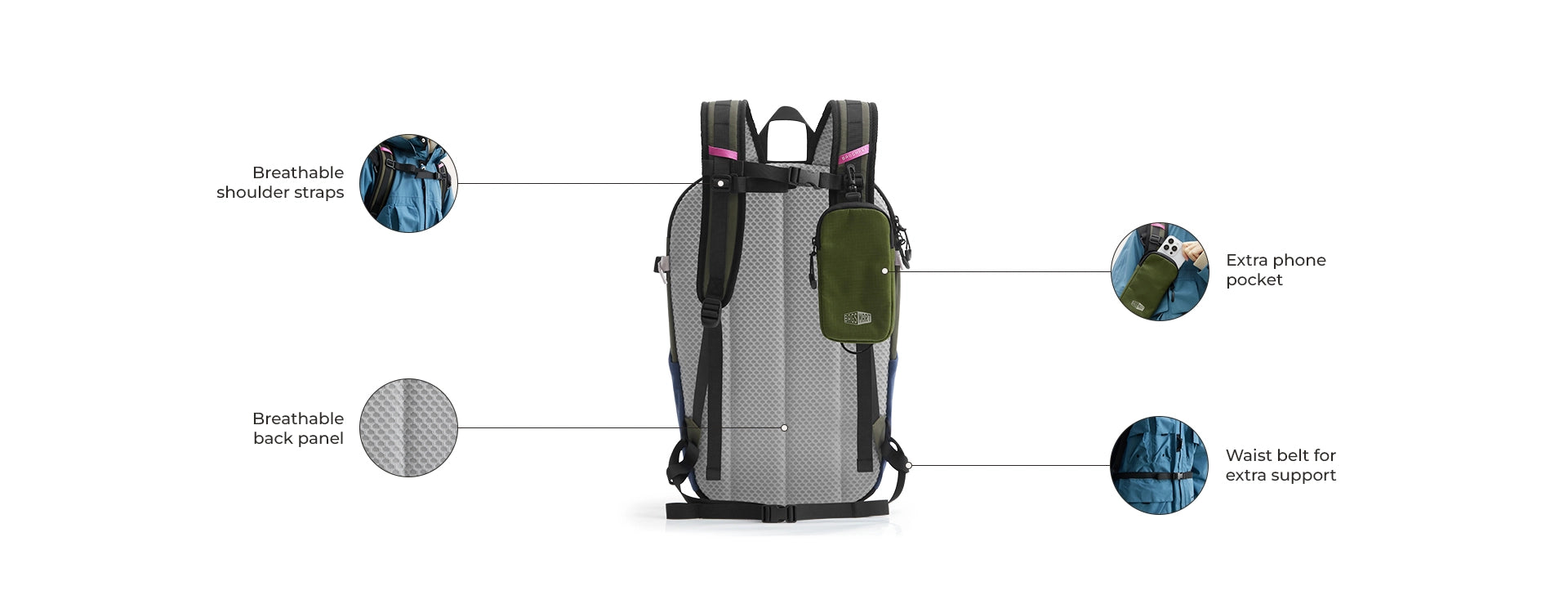 - Dedicated phone pocket keeps your most-used item instantly accessible.