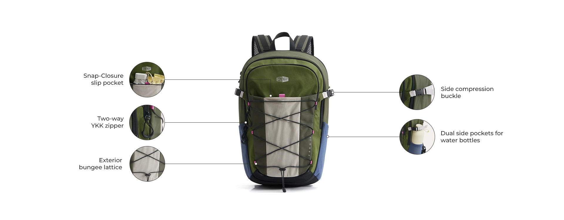 - Dual water bottle pockets support hydration on busy days.