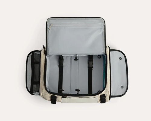 - Two-level fold-flat divider panel separates shoes, clothes, or gear.